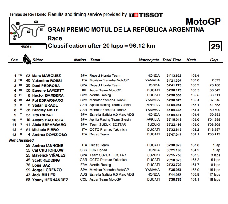 Tako je Rossiju u posljednji tren poklonjeno drugo mjesto, a isto bi se moglo reći i za treće mjesto Pedrose, koji je za svojim timskim kolegom i pobjednikom Marquezom zaostao ogromnih 28 sekundi. Pad vozača Ducatija i osipanje u sredini poretka omogućilo je Lavertyju da s dvije godine starim Ducatijem dođe do najboljeg rezultata MotoGP karijere i bodova za četvrto mjesto nakon što je u zadnjem krugu obišao Barberu i Pola Espargaroa, a nekoliko sekundi nakon njih ciljem je prošao Bradl a Aprilijom.