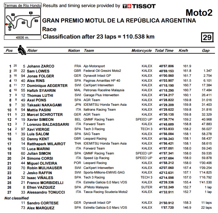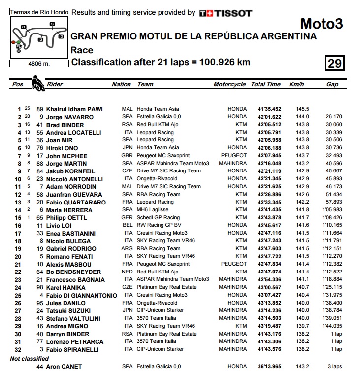 A mogla je to biti i dvostruka pobjeda Malezijaca da Norrodin nije u dvoboju s Navarrom za 2. mjesto pao u predzadnjem zavoju, nakon čega je treće mjesto naslijedio Binder, kojem su disali za vrat Locatelli, Mir i Ono. Nesretni Norrodin je na kraju ipak završio kao 11. i to nakon što je digao oštećeni motocikl i s njim doslovno protrčao kroz cilj, a nije bi posljednji koji će to učiniti.