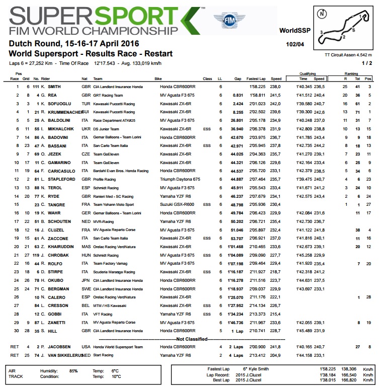 Iako je imao veliki zaostatak, Vd Mark je razveselio nizozemsku publiku osvajanjem trećeg mjesta, dok je Savadori prošao ciljem kao četvrti, što je najbolji rezultat Aprilije u dosadašnjem dijelu sezone. Davies je s Ducatijem završio kao 5., što je bilo i više nego dovoljno da zadrži drugu poziciju u ukupnom poretku, ali sada mu vodeći Rea bježi ozbiljnih 45 bodova.