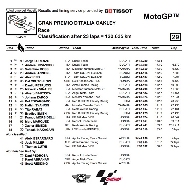 Bila je to pobjeda u stilu njegovih najboljih dana s Yamahom, što znači da je u Mugellu preuzeo vodstvo odmah nakon starta i nakon toga vozio precizno poput robota, malo pomalo nestajuću na horizontu. Na kraju je imao 6 sekundi prednosti u odnosu na timskog kolegu Doviziosa, što znači da je bio klasa za sebe dok je hitao ka onome što će biti njegova prva pobjeda s Ducatijem, ne nužno i posljednja. A to što je pobijedio baš u Mugellu, na Ducatijevom kućnom pragu, Lorenzu predstavlja dodatno zadovoljstvo i zbog toga nije obraćao pozornost na manjak pljeska i višak zvižduka iz redova uvijek strastvenih talijanskih navijača.