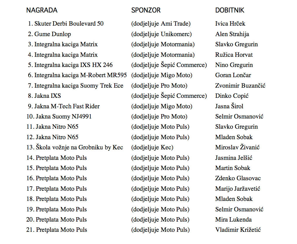 Izvučeni su dobitnici nagrada koji su glasali za Miss Motori 2010. preko govornog THT automata. Molimo dobitnike da nagrade podignu u redakciji Moto Puls (Davora Zbiljskog 16, Zagreb)