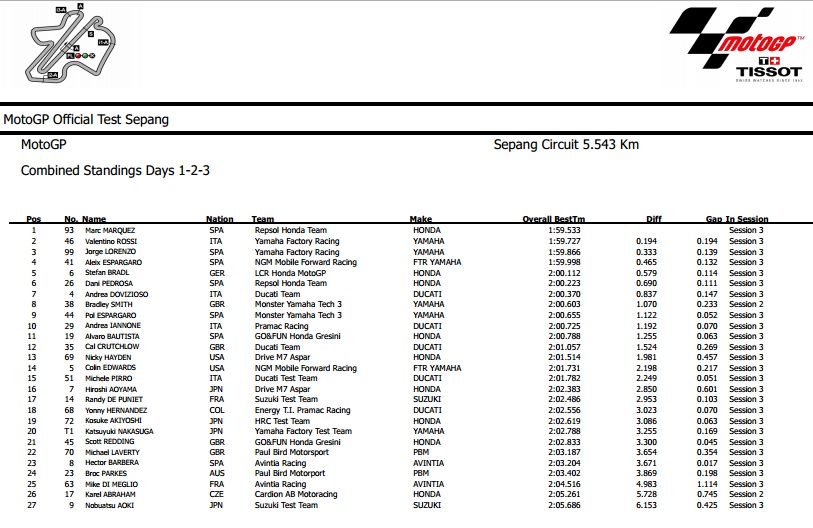 Prvo ime testiranja bio je aktualni svjetski prvak Marc Marquez, koji je se prvi spustio ispod 2 minute te se sva tri dana nije skidao s vrha poretka. Posljednjeg dana je ujutro postigao vrijeme od 1:59.533 i tako skinuo dosadašnji Stonerov rekord s tradicionalnih zimskih testiranja u Sepangu, da bi poslije podne odradio 15 uzastopnih krugova ispod oznake 2:01.