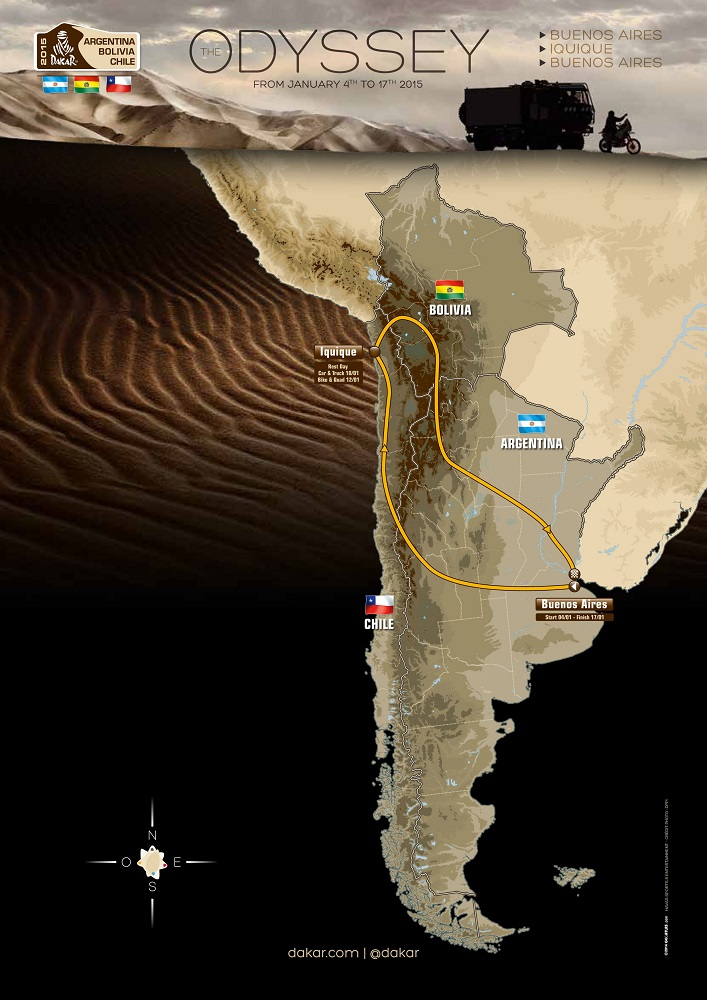 Biti će to velika kružna utrka po Južnoj Americi. Sa startom i ciljem u Buenos Airesu, rally Dakar 2015 ponovo vodi prostranstvima Argentine, Čilea i Bolivije