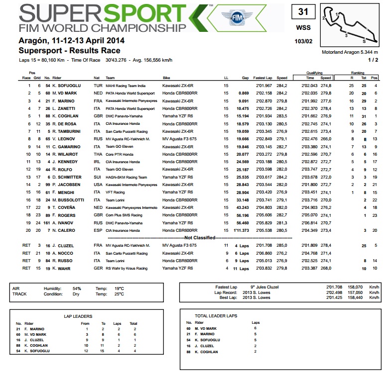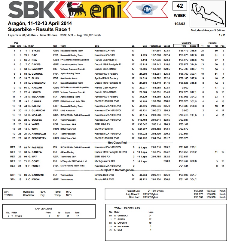 Po hladnijem jutarnjem vremenu, Sykes je u prvoj utrci na stazi Aragon jednostavno briljirao i pobijedio s 4 sekunde prednosti u odnosu na timskog kolegu Baza. Doduše, činilo se da će Baz završiti kao treći, no u posljednjem je krugu ispred njega pao Davide Giugliano s tvorničkim Ducatijem i na kraju završio kao 8. To je otvorilo put da se Jonathan Rea s Hondom popne na najnižu stepenicu pobjedničkog podija, dok su daleko iza njih poredak prve petorice zaokružili Davies (Ducati) i Laverty (Suzuki). Istovremeno, Guintoli je s Aprilijom završio kao 6., no svejedno je u provizornom ukupnom poretku držao prvu poziciju.