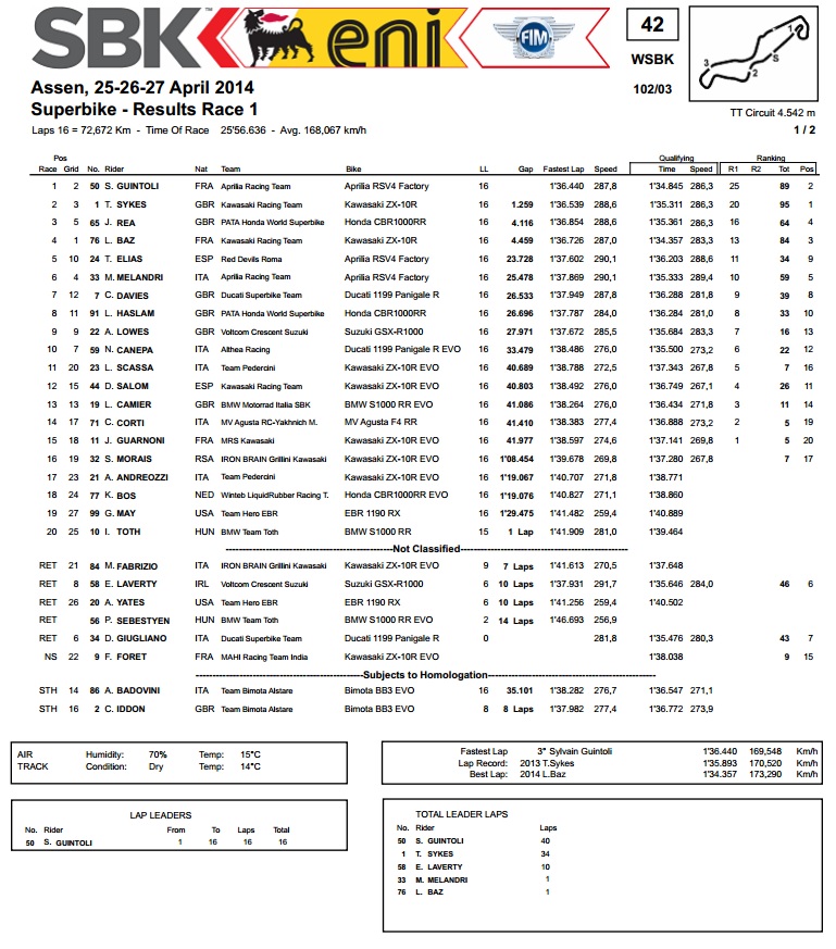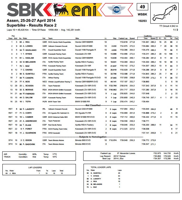 Kišno vrijeme u nizozemskom Assenu nije nikakvo iznenađenje, prije da je riječ o tradiciji, pa su tako obje Superbike odrađene u kasno jesenjem tonu. Pritom za vrijeme prve utrke nije padala kiša, no staza je mjestimice bila još taman toliko mokra da je vožnja na „slick" gumama tražila i popriličnu dozu hrabrosti.