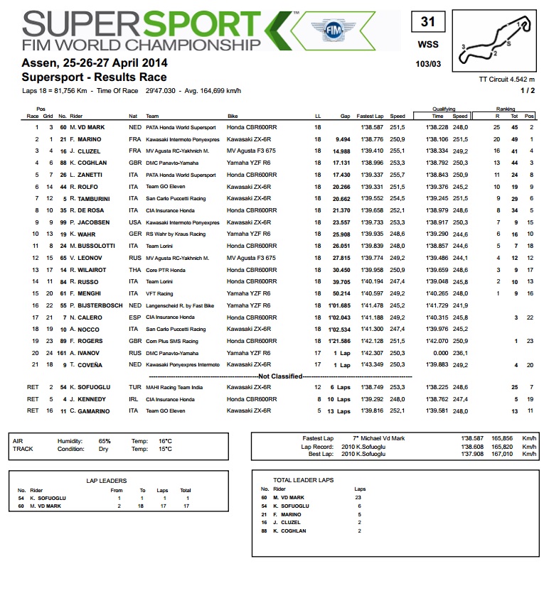 Honda je slavila i u Supersport utrci u kojoj je Michael Vd Mark pred domaćom publikom odnio svoju prvu pobjedu, tijekom koje je oborio i 4 godine stari rekord kruga. Drugoplasirani Marino je s Kawasakijem zaostao gotovo 10 sekundi, no broji se samo to da je s tim rezultatom preuzeo i vodstvo u ukupnom poretku. U borbi za treće mjesto Cluzel je tek u samoj završnici uspio odvojiti svoj MV Agustu od Coghlana (Yamaha) i Zanettija (Honda) dok je višestruki prvak Sofuoglu morao odustati zbog tehničkog kvara, što znači da mu kao jedini plasman ove sezone ostaje pobjeda u Aragonu.