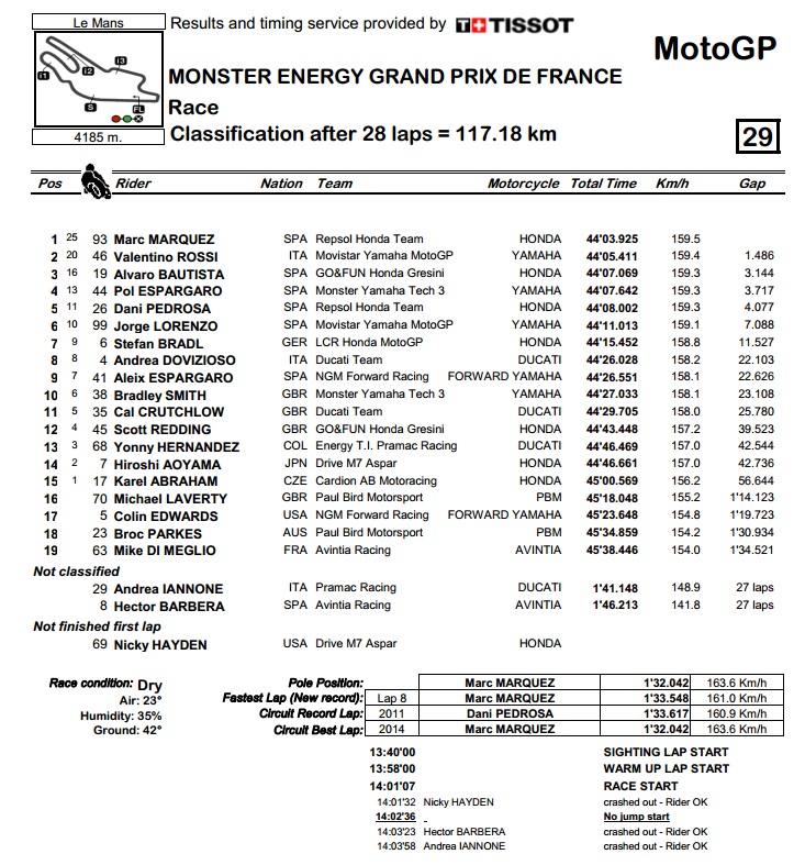 Mlađi brat Espargaro je u posljednjim krugovima bio i pod pritiskom Pedrose, no prošlogodišnji pobjednik u Le Mansu ovaj put nije mogao bolje od petog mjesta, ostavivši 3 sekunde iza sebe Lorenza, koji je odvozio još jednu blijedu utrku. Bila je to relativno blijeda utrka i za Bradla, koji se u početku borio za vodstvo, da bi na kraju završio kao usamljen 7., iako tu treba uzeti u obzir da je uoči Le Mansa, baš kao i Pedrosa, imao manju operaciju ruke.