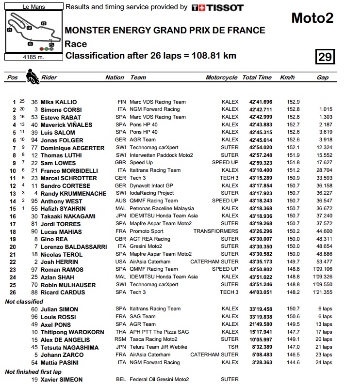 U Moto2 klasi je do druge pobjede zaredom došao Mika Kallio, koji je 8 krugova prije kraja preuzeo vodstvo od Corsija. U završnici utrke se Corsi našao i pod pritiskom Rabata, no vodeći u ukupnom poretku ovaj put nije mogao bolje od trećeg mjesta.