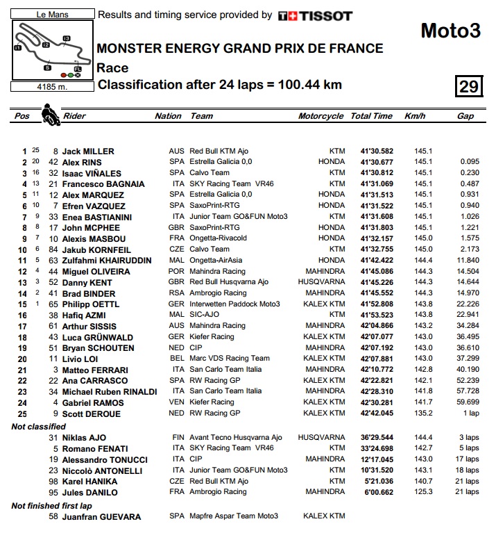 Moto3 utrka je bila frenetičnija i od ionako visokog prosjeka, što najbolje potvrđuje to što su prva desetorica završila u razmaku od samo 2 sekunde. Iako se u samoj završnici lagano sudario s Vazquezom, koji je zbog toga završio kao tek 6., Miller je s KTM-om došao do svoje treće ovogodišnje pobjede i tako se ozbiljno izdvojio na vrhu poretka, nakon što je njegov glavni konkurent Fenati morao odustati zbog tehničkih problema. Desetinku sekunde iza Millera ciljem je prošao Rins na Hondi, dok je treće mjesto pripalo Isaacu Vinalesu, kojem je to prvi podij u karijeri.