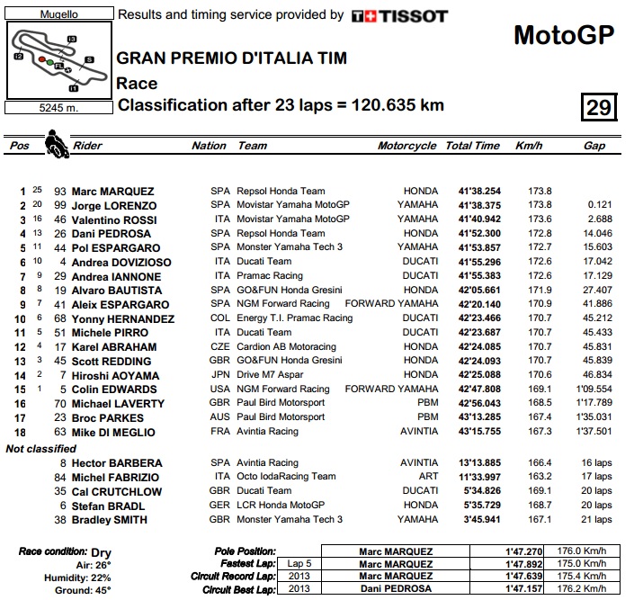 Bila je to vrlo dobra utrka i za Rossija, koji je na radost domaće publike 187. puta stajao na podiju u jubilarnoj 300. utrci. Iako je startao tek sa 10. mjesta, Rossi se u jednom trenutku približio vodećem dvojcu na samo sekundu razmaka, no u završnici je posustao i prošao ciljem s 2,7 sekundi zaostatka za Marquezom. S prevelikih 14 sekundi kašnjenja za pobjednikom i timskim kolegom, „nevidljivi" Pedrosa je završio kao 4., pri čemu ga je umalo uhvatio sve bolji Pol Espargaro s Tech3 Yamahom. Manje od desetinke sekunde dijelilo je vozače Ducatija, pri čemu je Dovizioso na kraju bio spretniji i osvojio 6. mjesto, dok je Iannone na početku utrke imao to zadovoljstvo da vodi pred domaćom publikom.