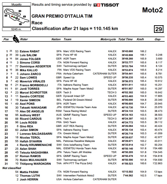 U Moto2 klasi je najveći dio utrke vodio Folger ispred Saloma, no stvari su se počele rasplitati tek kad ih je sustigao i prestigao Rabat i nametnuo svoj ritam. Folger ga nije mogao slijediti i ubrzo se pomirio s osvajanjem 3. mjesta, dok je Salom grizao do samog kraja i prošao ciljem četvrtinu sekunde iza Rabata, koji je novom pobjedom pobjegao timskom kolegi Kalliu i učvrstio se na vrhu ukupnog poretka.