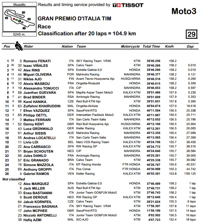Svaka ovogodišnja Moto3 utrka je napeta priča za sebe, no ova je bila još luđa od prosjeka. Uoči same završnice je 1,5 sekunde dijelilo prvih 13 vozača, pa tako ne čudi da su se u posljednjem krugu sudarila trojica vozača među kojima i Jack Miller i Alex Marquez. To je donekle olakšalo posao Fenatiju, koji je pred svojom talijanskom publikom i s KTM-om obojanim u talijansku trobojnicu kao treći izašao na startnu ravninu, gdje je iskoristio zavjetrinu i pobijedio za jednu stotinku sekunde. Vinales (KTM) i Rins (Honda) su imali potpuno isto vrijeme, tako da je Vinalesu pripalo drugo mjesto na ime bržeg najbržeg kruga, dok su unutar razmaka od samo 6 desetinki sekunde za pobjednikom ciljem prošli Oliviera (Mahindra), Ajo (Husqvarna), Masbou (Honda) i Tonucci (Mahindra). Takvim raspletom se Fenati približio na samo 5 bodova zaostatka za Millerom.