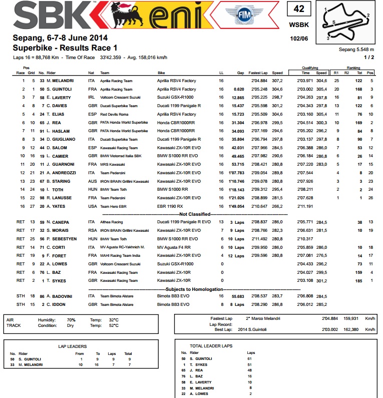 Sepang (Malezija), 8. lipnja 2014. – Ovo kolo svjetskog Superbike prvenstva, koje je po prvi put održano na stazi u Sepangu, bilo je u znaku Aprilije koja je dominirala u obje utrke. Dvostruka pobjeda Marca Melandija i dvostruko osvajanje drugog mjesta Sylvaina Guintolija potvrdili su nadmoć koju je tijekom treninga na Malezijskoj stazi pokazala Aprilia RSV4, uključujući i Apriliju Tonia Eliasa koji ne vozi za Aprilijin tvornički tim.