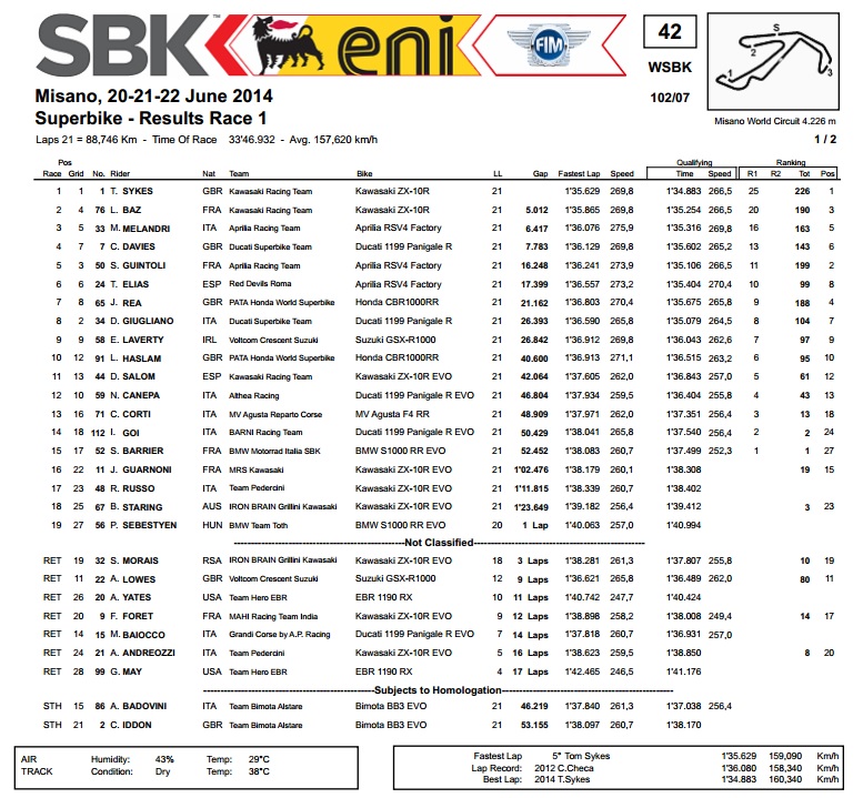 Utrkom u Misanu, aktualno Superbike prvenstvo se prelomilo u svoju drugu polovicu, a Sykes je dodatno slomio otpor svojih izazivača na putu do obrane naslova prvaka. Nakon što je 21. put bio najbolji u kvalifikacijama, Sykes nije vodio obje utrke baš od početka od kraja, no nije bio ni daleko od toga. Naime, u prvoj utrci je najbolje startao Elias s Aprilijom, da bi se Sykes već do kraja prvog kruga domogao vodstva, gdje je ostao do samog kraja, slaveći s 5 sekundi prednosti u odnosu na timskog kolegu Baza na drugom Kawasakiju, oborivši usput i rekord kruga. Melandri se s Aprilijom uspio oduprijeti Daviesu na Ducatiju te je tako zaslužio stajanje na najnižoj stepenici pobjedničkog postolja, dok je njegov kolega Guintoli završio kao peti s velikih 16 sekundi zaostatka.