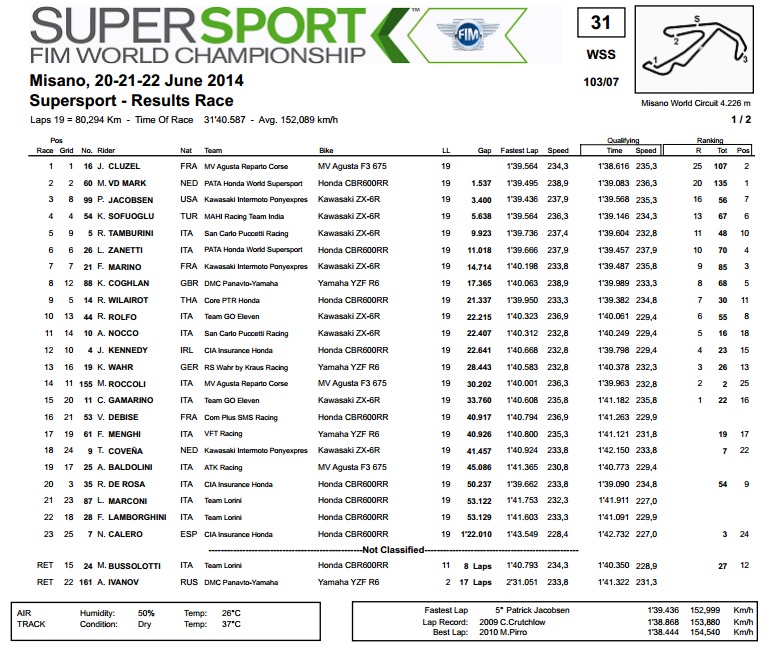 Utrka u klasi Supersport prošla je u znaku talijanske marke MV Agusta i francuskog vozača Cluzela. Najbrži na treninzima i kvalifikacijama, Cluzel i trocilindrični F3 675 bili su u vodstvu od početka do kraja, a uspješno su se oduprli pritisku VD Marka, koji je u završnici utrke izvlačio maksimum iz svoje Honde. Time je Cluzel malo smanjio svoj zaostatak, no VD Mark još uvijek ima solidnih 28 bodova prednosti, dok je istovremeno Sofuoglu nastavio s razočaravajućim rezultatima i izgubio realne šanse da se uključi u borbu za novi naslov. Naime, Turčin je utrku završio kao četvrti, iza američkog vozača Jacobsena na drugom Kawasakiju, kojem je to bilo prvo stajanje na pobjedničkom podiju.