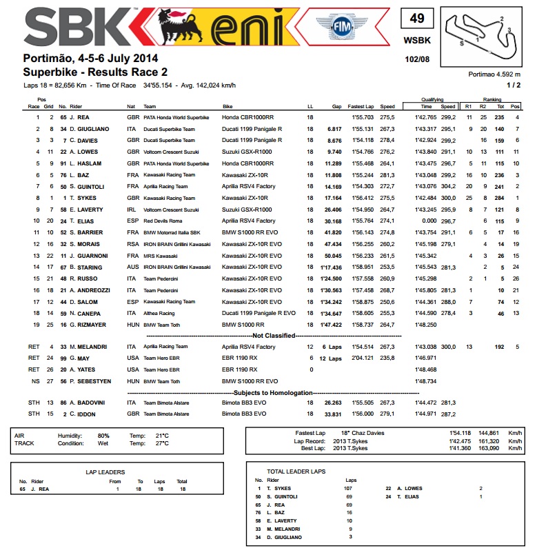 Nažalost, taman kad su sustigli vodeću Hondu, Guintoli je u sporom zavoju agresivno napao Melandrija, pogodio neravninu i srušio obojicu, nakon čega je Rea rutinski odnio 4. pobjedu sezone, s velikom prednošću ispred Ducatijeva dvojca Giugliano – Davies, koje je opasno pritiskao Lowes na Suzukiju. Posrnuli Guintoli je uspio nastaviti te je čak sustigao Sykesa i pomaknuo ga na 8. mjesto, no otevši mu samo jedan bod propustio je veliku priliku da se sasvim vrati u borbu u za naslov.