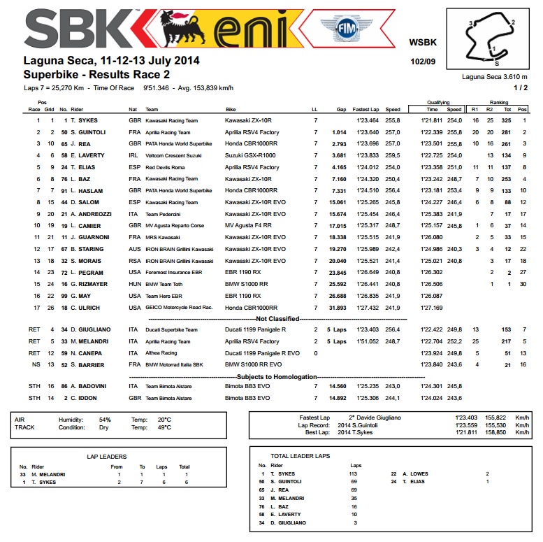 Klasa Supersport je propustila okupljanje u Laguna Seci, a svi zajedno se vraćaju u akciju tek za dva mjeseca utrkom u Jerezu, nakon čega slijede još samo okupljanja u Magny Coursu, možda u JAR-u i završetak sezone u Kataru. Sa 44 boda razlike u odnosu Guintolija, čini se da je Sykes već sada sasvim blizu obrane titule svjetskog prvaka.