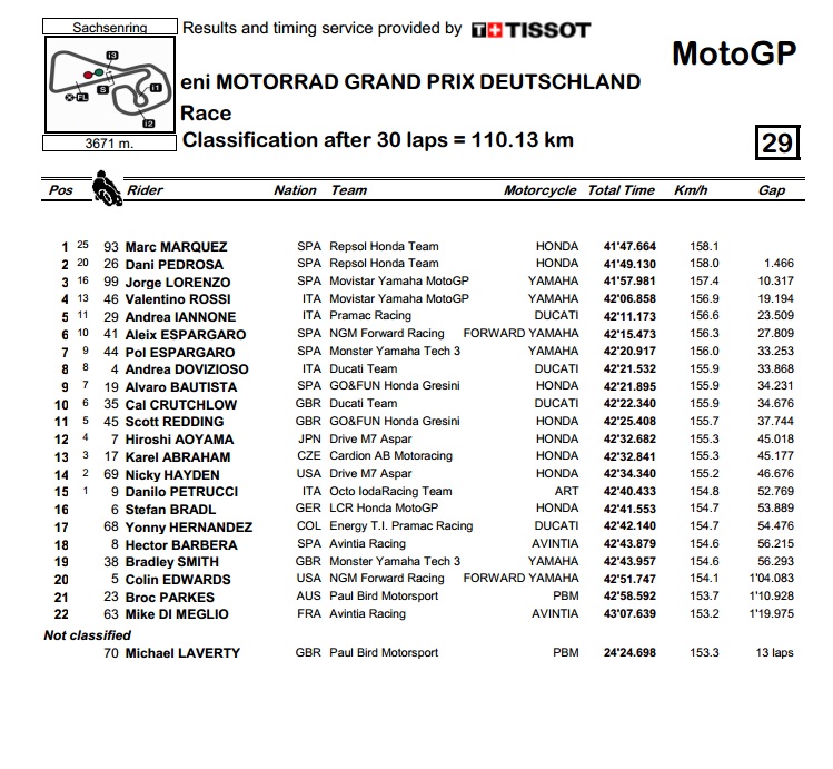 Lorenzu je, nakon katastrofe u Assenu, povratak na pobjednički podij bio melem na ranu, utoliko više što je uspio pobijediti svog timskog kolegu Rossija, što je prava rijetkost ove sezone. Pritom je Rossi završio kao četvrti, dok je „privatnik" Iannone bio najbrži vozač Ducatija i tako zaokružio poredak prve petorice. Kad je ukupni poredak u pitanju, Marquez sada ima velikih 77 bodova prednosti u odnosu na Pedrosu, odnosno 84 boda viška u odnosu na Rossija, što znači da bi mogao komotno propustiti sljedeće tri utrke, a svejedno biti u vodstvu sredinom rujna uoči okupljanja u Misanu.