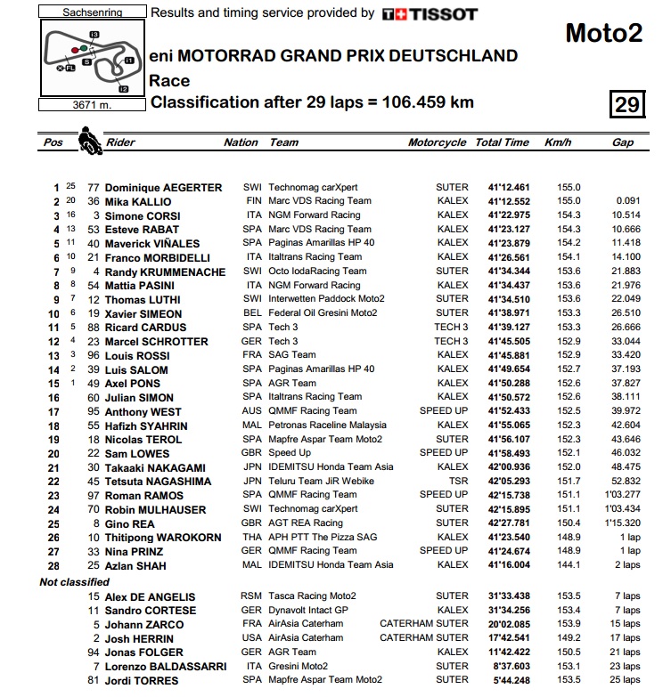 Utrku u klasi Moto2 je obilježio švicarsko-finski dvoboj Aegertera i Kallia, koji su pobjegli ostatku kolone desetak sekundi i onda se do posljednjeg kruga borili za pobjedu. Na kraju je Aegerter odnio svoju prvu pobjedu u karijeru, dok je Kallio sa zaostatkom od samo 9 stotinki sekundu uspio malo smanjiti bodovni zaostatak za i dalje vodećim Rabatom, koji je završio kao četvrti u sendviču između trećeplasiranog Corsija i petog Vinalesa.