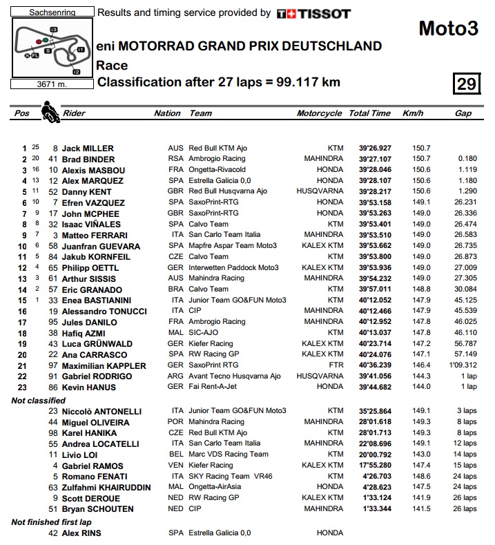 U klasi Moto3 se sasvim izdvojila skupina od petorice vozača, koju je, praktično od početka do kraja utrke predvodio Miller s KTM-om, pobijedivši na kraju ispred Bindera na Mahindri i Masboua na Hondi. Tako se Miller, nakon nekoliko slabijih utrka ponovo malo izdvojio u ukupnom poretku, to više što je Marquez završio kao 4., Vazquez kao 6., dok su Fenati i Rins svoje nastupe završili padovima.