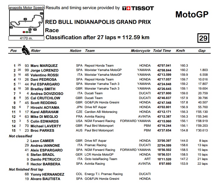Nepobjedivosti Marqueza ne vidi se kraja. Na protočnije oblikovanom i nanovo asfaltiranom krugu u Indianapolisu, koji je sada samo 50 metara kraći, a otprilike čak 6 sekundi brži, aktualni svjetski prvak nije imao pretežak posao. Na startu utrke je prepustio drugima da kolo vode, našavši se gotovo slučajno u vodstvu nakon laganog sudara Rossija i Doviziosa. No, Rossi se do kraja kruga ponovo probio na vodeću poziciju i tu uživao slijedećih desetak minuta, sve dok se njegov timski kolega Lorenzo nije odlučio probiti naprijed i pritom stvorio dovoljno komešanja u prvih nekoliko zavoja da Marquez u jednom potezu obiđe oba vozača Yamahe. I više se nije osvrtao.