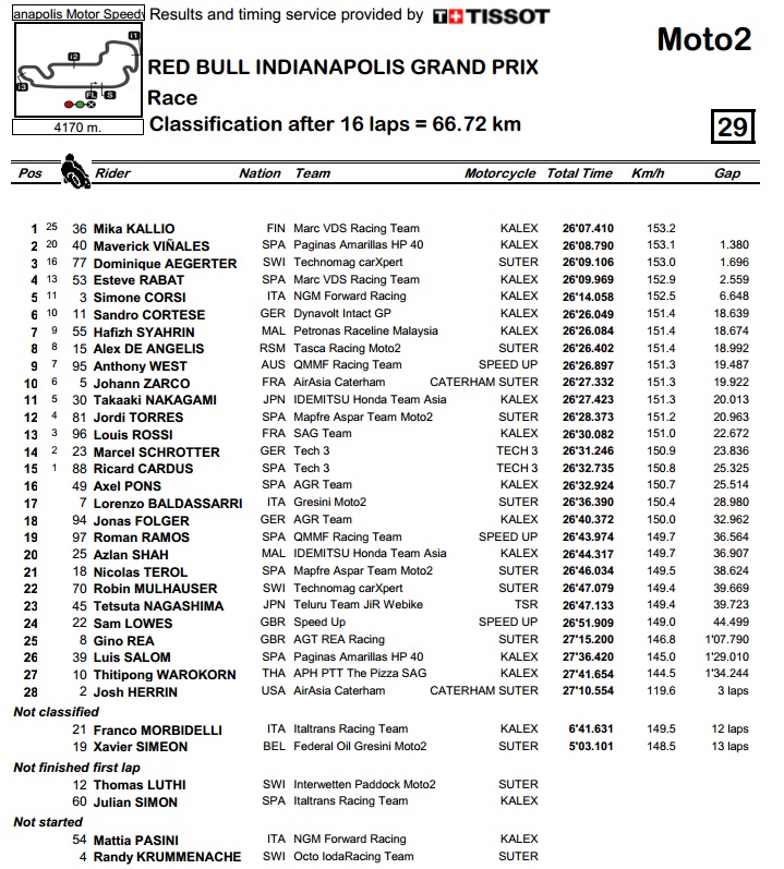 I dok je u MotoGP konkurenciji praktično sve riješeno, u klasi Moto2 stvari postaju sve kompliciranije. U utrci koje je bila prekinuta zbog masovnog sudara, pa onda odrađena po skraćenom programu od 16 krugova, Kallio je odnio pobjedu i tako se na samom vrhu ukupnog poretka približio na tek 7 bodova razlike timskom kolegi Rabatu, koji je učinio pogrešku dva kruga prije kraja i nakon toga potonuo s druge na četvrtu poziciju. Između njih su se nagurali „rookie" Vinales ( koji je sve bliže prelasku u MotoGP sa Suzukijem) i sve bolji Aegerter.