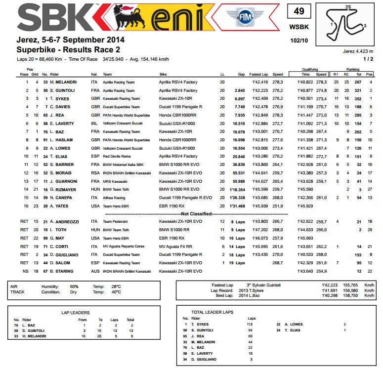 U prvoj utrci u Jerezu sve je počelo baš tako. Guintoli je s Aprilijom poveo, dok se Sykes sa Kawasakijem borio na rubu prve desetorice. No, kako je utrka odmicala tako se Guintoli sve teže borio sa istrošenim gumama dok je njegov timski kolega Melandri bio sve brži te ga je nekoliko krugova prije kraja lagano obišao na putu do pobjede i tako mu izbio 5 bodova. Da stvar bude nepovoljnija po Guintolija, Sykes je profitirao od toga što su odustali neki vozači ispred njega, pa se tako domogao 5. mjesta, iza trećeplasiranog Daviesa na Ducatiju i Reae na Hondi te malo ispred Lavertyja na Suzukiju.