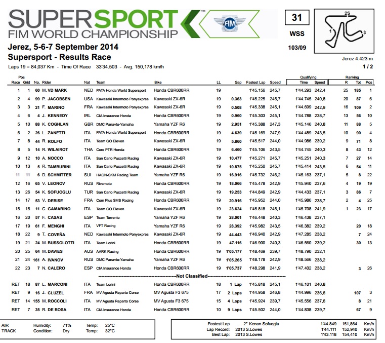 U klasi Supersport je već sve riješeno. Bila je to fantastična utrka u Jerezu, u kojoj je, iako je još imao samo teoretske šanse za naslov, Cluzel dao sve od sebe i svoje MV Aguste. Usprkos vidljivih problema sa mjenjačem, Cluzel se fanatično borio s Marinom na Kawasakiju i VD Markom na Hondi, sve do pretposljednjeg kruga kada se u zadnjem zavoju probio s trećeg na prvo mjesto, ali je pritom i malo pretjerao pa se su njegovi snovi u naslovu prvaka rasplinuli u pijesku. Tako je pobjeda pripala VD Marku na Hondi, koji je na najbolji način potvrdio osvajanje titule svjetskog prvaka, dok je drugo mjesto ugrabio američki vozač Jacobsen na Kawasakiju, koji je iskoristio pomutnju koju je izazvao pad Cluzela te se probio ispred svog timskog kolege Marina.