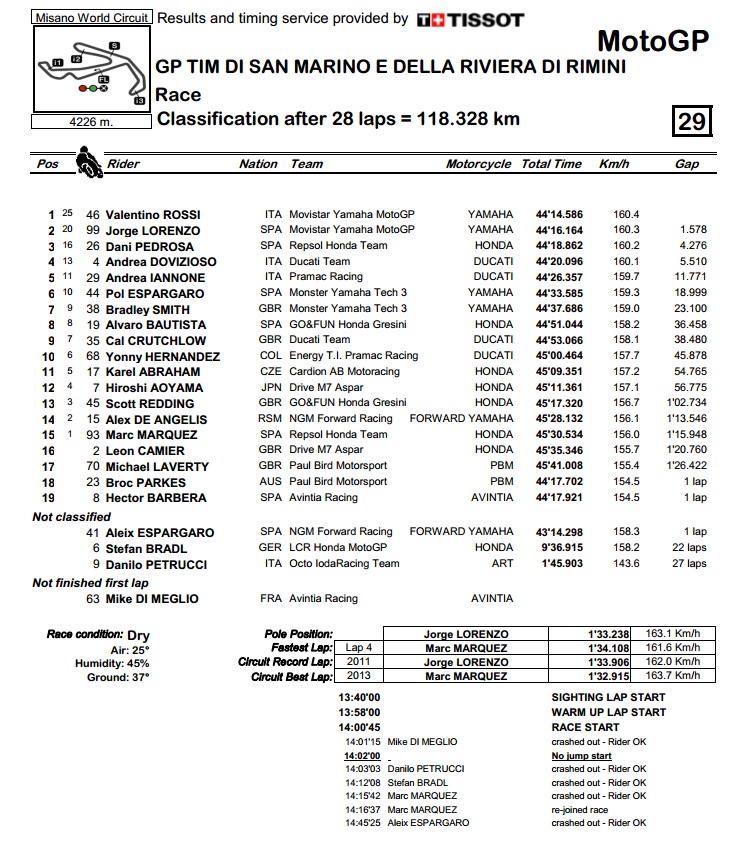 Tako je - na putu do prve pobjede nakon više od godinu dana, odnosno tek druge pobjede u posljednje četiri godine - Rossiju pred oduševljenom domaćom publikom preostalo tek nizanje brzih krugova i držanje Lorenza na sigurnom razmaku od 2 sekunde. Treće mjesto je osvojio Pedrosa, koji se s Hondom nije uspijevao ozbiljnije odvojiti Ducatiju u rukama Doviziosa, dok se Iannone pobrinuo da među prvom petoricom budu tri Talijana i dva Ducatija.