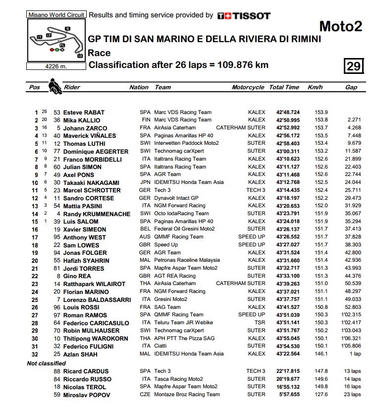 U klasi Moto2 su vozači momčadi Marc VDS Racing ponovo bili klasa za sebe. Kao i u Silverstoneu, najbolje je krenuo Kallio, ali pritom nije uspio dovoljno pobjeći Rabatu, koji postaje sve brži kako utrka odmiče. Osam krugova prije kraja Rabat je preuzeo vodstvo i otišao do treće uzastopne pobjede, povećavši svoju zalihu u odnosu na Kallia na još uvijek „napeta" 22 boda. Treći je ciljem prošao Zarco na Caterham Suteru, dok je Vinales prošao ciljem kao 4. i tako eventualne snove o naslovu sveo na teoriju.