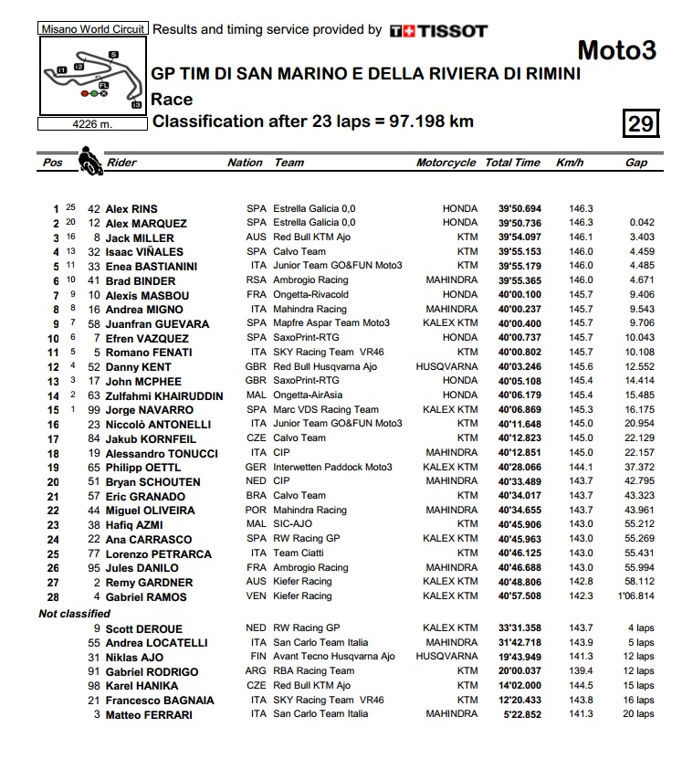 Klasa Moto3 najavljuje još jednu infarktnu završnicu sezone. Iako je ozlijedio obje noge na zagrijavanjima, Rins je došao do nove pobjede nakon što se cijelu utrku ponovo borio s timskom kolegom Alexom Marquezom, koji je kasnio samo 42 tisućinke sekunde. Treće je mjesto pripalo Milleru, koji sa svojim KTM-om ponovo nije mogao napasti vodeće Honde, ali je svejedno još uvijek na vrhu poretka, s tankih 9 bodova prednosti u odnosu na Marqueza i dostižnih 20 bodova u odnosu na Rinsa.