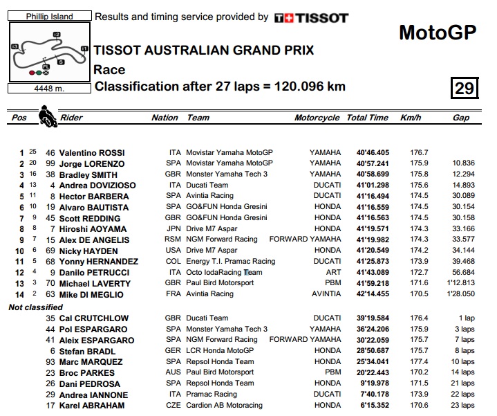 Tko zna kako bi se situacija rasplela da se Iannone u kočenju u Honda zavoj nije zaletio u Pedrosu i obojicu izbacio iz igre, a u istom se zavoju 20 minuta kasnija prekočio i Bradl, čija je kolateralna žrtva bio Aleix Espragaro. S tako brojnim odustajanjima viđenijih vozača, mnogi su imali priliku za rezultat svoje karijere, među njima i Bradley Smith, koji je završio kao treći, pa je tako Yamaha prvi put od 2008. godine imala tri vozača na pobjedničkom podiju. Četvrto mjesto pripalo je Doviziosu na tvorničkom Ducatiju, dok je, pola minute nakon Rossija, u borbi za peto mjesto prvi na ciljnu ravninu izašao Scott Redding s „production" Hondom, ali su ga do kockaste zastavice pretekli Barbera na Open Ducatiju i Bautista na „pravoj" Hondi. Ukupno je utrku završilo samo 14 vozača.
