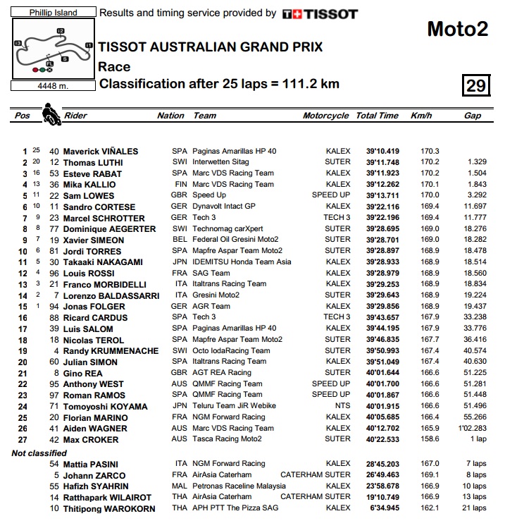 U svojoj prvoj (i zasad posljednjoj) sezoni u Moto2 klasi, Maverick Vinales je došao do svoje treće pobjede. Najbolje je sačuvao „materijal" za završnicu utrke i prošao ciljem sekundu i pol ispred Luthija i Rabata. Budući je Kallio prošao ciljem kao četvrti, Rabat je svoju prednost rastegnuo na 41 bod, što je samo dvije utrke prije kraja doista teško dostižno.