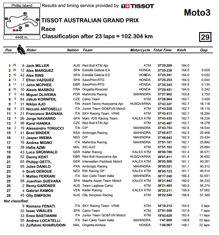 Zato se u klasi Moto3 situacija malo zakomplicirala. O dramatičnosti utrke najbolje govori to da je na kraju šesti Masbou prošao ciljem samo 24 stotinke iza pobjednika Jacka Millera na KTM-u, koji nije samo pobijedio pred domaćom publikom, nego se i vratio u igru za naslov prvaka. Doduše, trenutno vodeći Alex Marquez je u maksimalno napetoj završnici kasnio samo 3 stotinke sekunde te tako osvojio 2. mjesto, što znači da bodovni razmak između njih dvojice još uvijek iznosi respektabilnih 20 bodova. Treći je bio Rins, četvrti Vazquez, a peti McPhee, svi osim Millera na Hondinim motociklima.