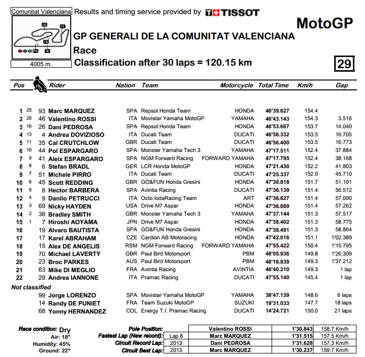 Nakon slavlja s mlađim bratom, Marc Marquez se mogao u miru posvetiti dohvaćanju 13. pobjede ove sezone, čime bi oborio još jedan rekord. Iako je utrku poveo Iannone s Ducatijem, bilo je jasno da to ne može duže potrajati, pa je tako na vrh lako isplivao Marquez, kojeg su u stopu pratili Rossi i Pedrosa. Taj poredak će ostati do samog kraja, samo će se razmaci između njih bitno povećati, posebno za vrijeme kratkotrajne kišice, koja je djelomično natopila stazu.