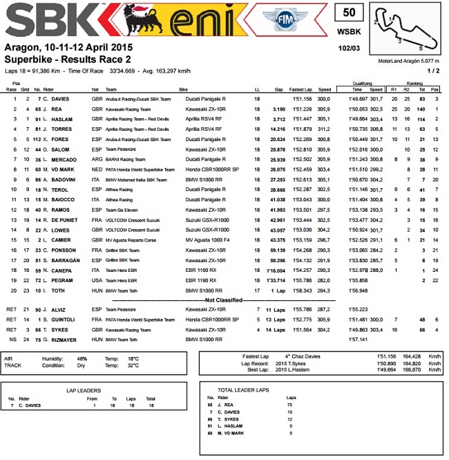 Haslam još drži priključak, ali sada zaostaje 24 boda, dok je Davies prestigao Sykesa, koji je pao već u petom krugu druge utrke. I aktualni prvak Guintoli je pao samo jedan krug kasnije, nakon što je u prvom nastupu bio tek 9., te je tako novopečeni vozač Honde već u ovoj ranoj fazi sezone bajku o eventualnoj obrani naslova pomaknuo u sferu znanstvene fantastike.