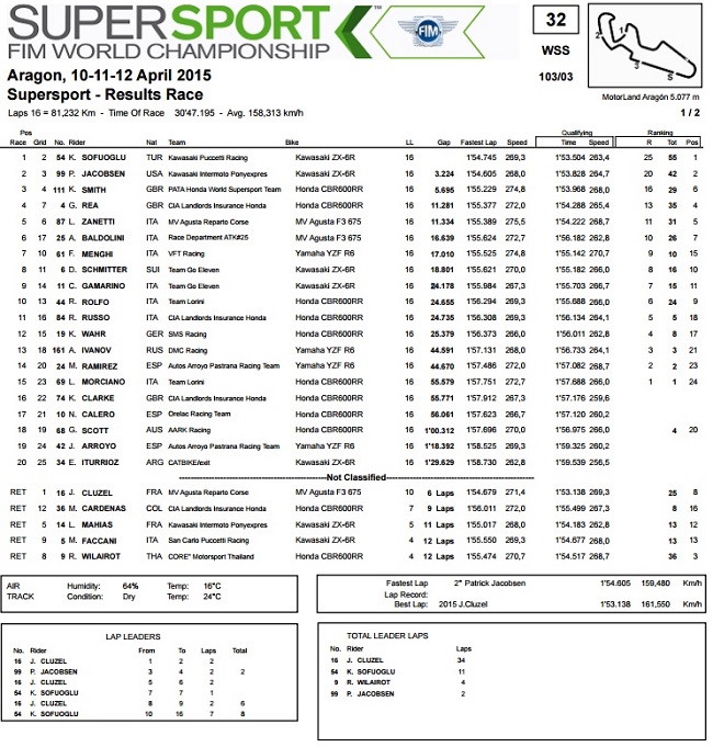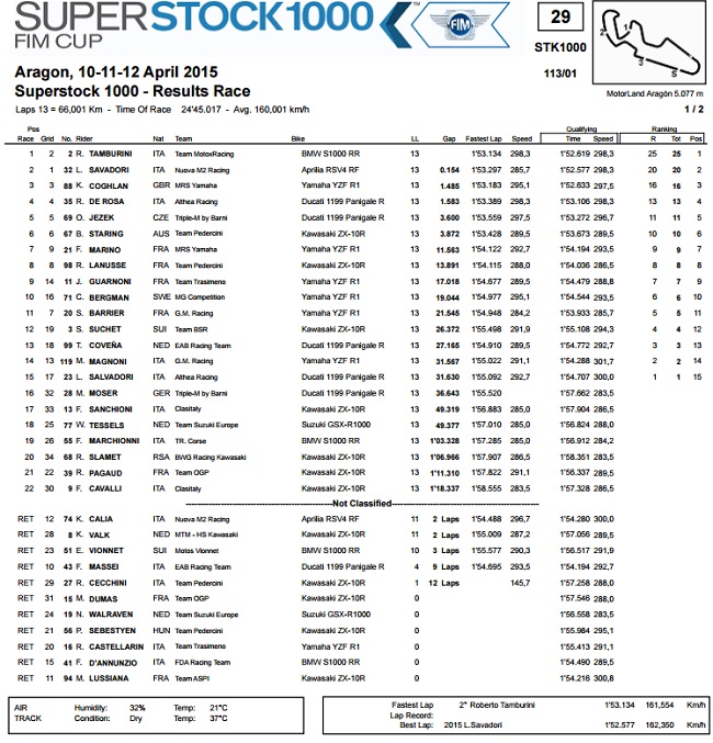 U Aragonu je započelo i prvenstvo u klasi Superstock 1000, zanimljivo i zbog toga što se tu kroz mala vrata u Superbike prvenstvo vraća i Yamaha s novom R1. Tijekom dobrog dijela utrke se činilo da bi svoju premijeru mogli uveličati pobjedom, no na kraju je Coghlan završio kao treći, iza pobjednika Tamburinija na BMW-u i Savadorija na Apriliji.