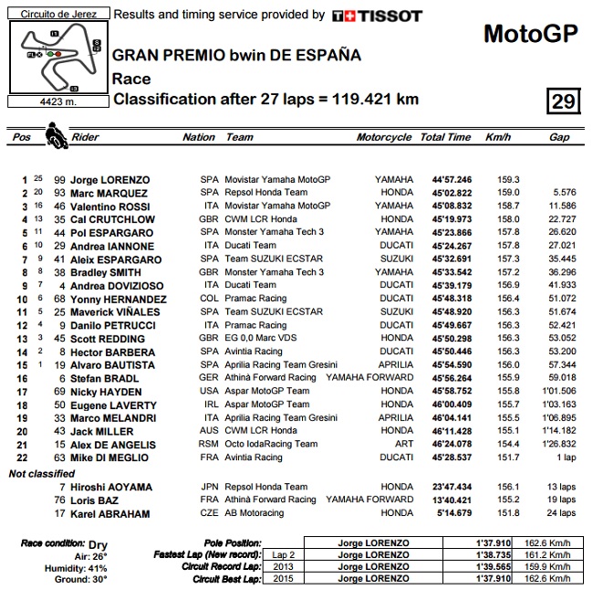 U Kataru se borio za pobjedu dok mu se nije počela raspadati kaciga, u Teksasu je bio nešto boležljiv, u Argentini je odabrao krivu smjesu guma. Kao i godinu ranije, Lorenzo je dosta loše započeo sezonu. No, u Jerezu se vratio u igru. Prvo je objavio kako je stavio potpis na ugovor te da će i iduće godine voziti tvorničku Yamahu (iako nismo ni znali da je to bilo upitno), a onda je bio najbrži na treninzima, kvalifikacijama i, konačno, u utrci.
