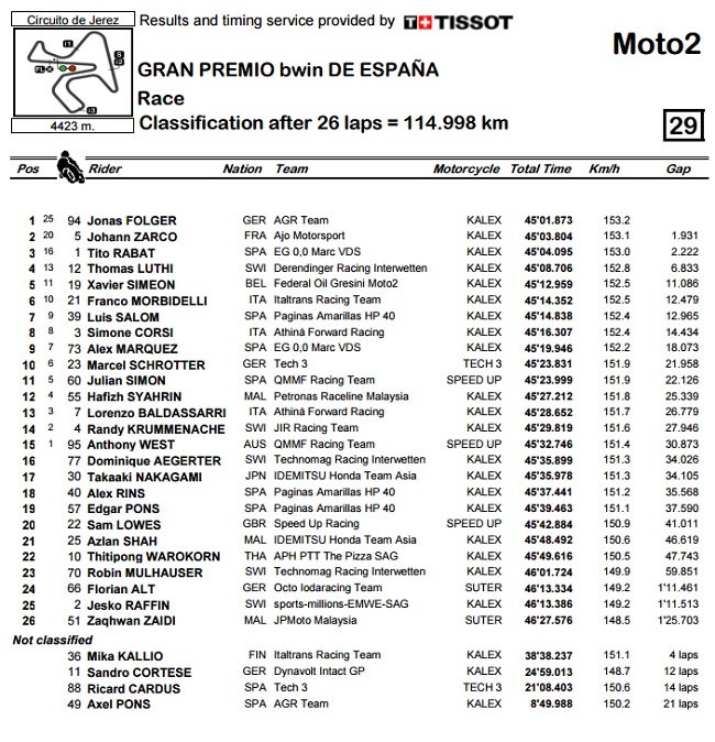 Ni, u klasi Moto2 nije bilo previše napeto po pitanju pobjednika, ali je sama utrka bila sadržajnija. Najbolje je krenuo aktualni prvak Rabat, koji se konačno probudio iz letargije, no ne do te mjere da bi se mogao otarasiti Folgera. Jednom kad ga je prošao, Nijemac se više nije osvrtao na putu do druge pobjede ove sezone, dok je Rabat počeo magnetski privlačiti novajliju Rinsa, koji ga je konačno sustigao u posljednjem krugu. Kao što se i očekivalo, Rins je odlučio napasti u posljednjem zavoju, ali je, kako to tamo obično biva, pogriješio u procjeni, zakačio stražnji kotač Rabata i tako sve zaključio spektakularnim padom. Istovremeno, Zarco je iskoristio taj incident da se na izlasku na ciljnu ravninu provuče ispred Rabata i osvoji bodove za drugo mjesto, koji su ga učvrstili na vodećoj poziciji u ukupnom poretku.