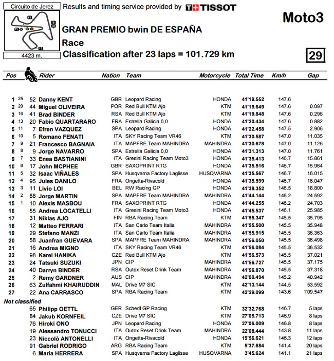 Utrka dana je bila ona u Moto3 konkurenciji. Sve do posljednjeg zavoja u igri za pobjedu su bila četvorica vozača, a sve se zakompliciralo i razriješilo u posljednjem zavoju kada se rookie Quartararo pokušao probiti sasvim naprijed, ali je prekasno kočio, imao kontakt s Kentom i proširio putanju. Kent je s Hondom svejedno došao do treće pobjede u nizu, Oliveira i Binder su prošli ciljem kao drugi i treći, obojica na KTM-u, dok je nes(p)retni Quartararo bio 4., s manje od 9 desetinki zaostatka za pobjednikom.