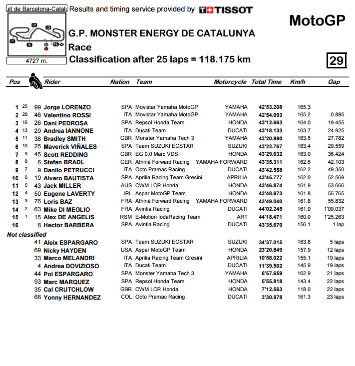 Čast Honde je, donekle, obranio Pedrosa, koji je utrku završio kao treći, ali s velikih 20 sekundi zaostatka. Četvrto mjesto je osvojio Iannone s Ducatijem, koji se tako probio na treće mjesto u ukupnom poretku, Smith je s Yamahom bio peti, dok je Vinales sa Suzukijem završio šesti i tako ostvario najbolji rezultat u svojoj kratkoj MotoGP karijeri. Najbolje rezultate ove sezone ostvarili su sedmi Scott Redding, osmi Stefan Bradl i deseti Bautista s Aprilijom.