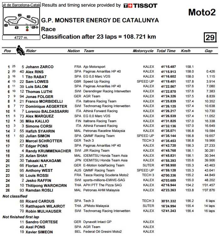 U Moto2 kategoriji su veći dio utrke vodeću grupu činili Rabat, Rins i Lowes, no u završnici ih je počeo sustizati Zarco. Lowes se prvi predao i pomirio sa osvajanjem 4. mjesta, dok je Rins u pretposljednjem krugu pogriješio i otišao preširoko u dugom desnom zavoju, što je Zarco odmah iskoristio i probio se na drugo mjesto. Nakon toga je počeo pritiskati Rabata, koji u posljednjem krugu također čini grešku i prepušta Zarcu pobjedu, a Rinsu drugo mjesto.