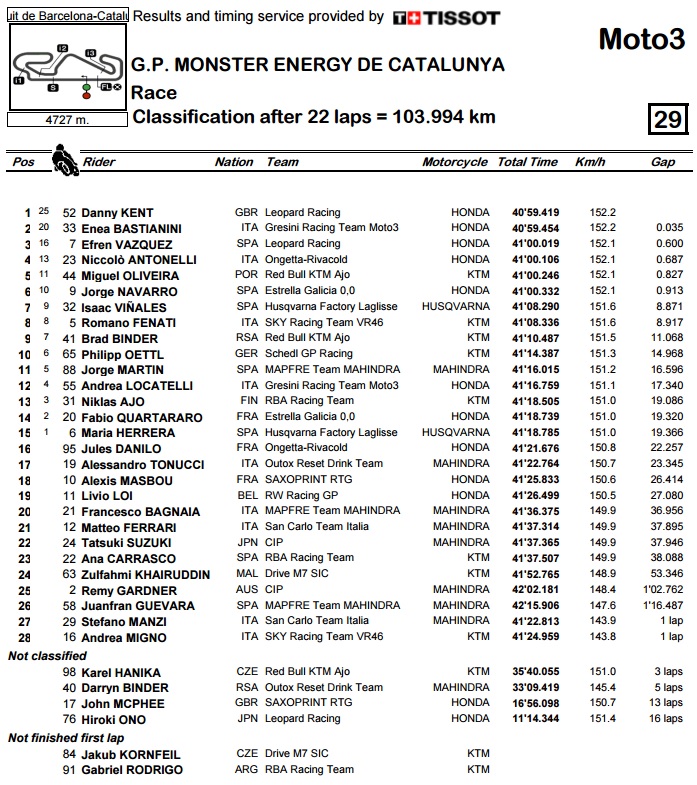 Nakon što je vidio da se nikako ne može odlijepiti od progonitelja, Kent se u završnici Moto3 utrke povukao u zavjetrinu i čuvao resurse za posljednji krug. Na kraju je pobijedio sa tri stotinke prednosti u odnosu na Bastianinija, kojem je pobjegao na velikih 51 bod prednosti u ukupnom poretku. Unutar sekunde za pobjednikom ciljem su redom prošli i Vazquez, Antonelli, Oliveira i Navarro, pri čemu su svi bili za upravljačem Honde, osim Oliveire, koji je vozač KTM.