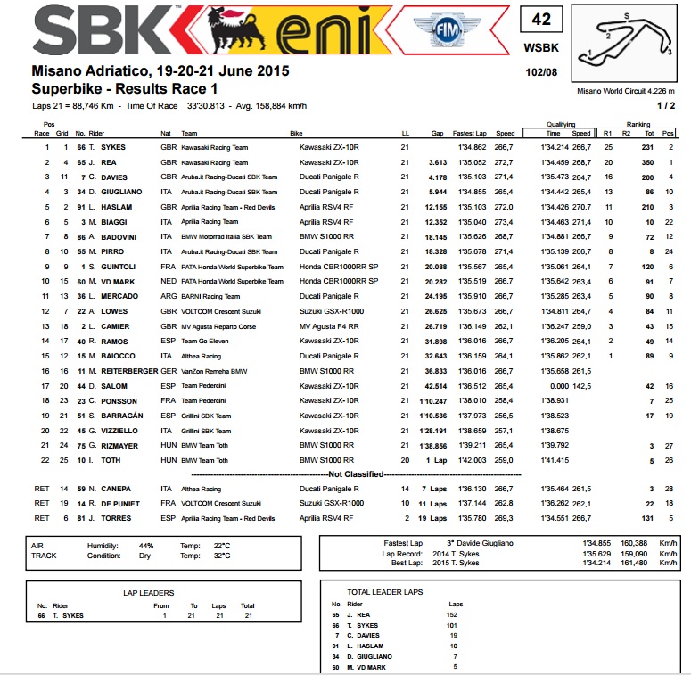 U prvoj utrci u Misanu nakratko se činilo da bi Rea prvi put ove sezone mogao ostati bez podija, no radilo se tek o tome da je izabrao nešto drugačiju smjesu gume i zapeo u gužvi nakon starta. Kako je utrka odmicala prema kraju tako je Rea bio sve brži, da bi nekoliko krugova prije kraja, zajedno s Daviesom, prestigao dotad drugoplasiranog Giugliana s Ducatijem. Nakon toga se u zadnjem zavoju zadnjeg kruga Davies s drugim Ducatijem probio ispred vozača Kawasakija, no Rea je ipak prije njega stigao do ciljne crte. Brži od njega bio je samo timski kolega Sykes, koji je krenuo u trku s prve startne pozicije i nakon toga dominirao od prvog do posljednjeg kruga.