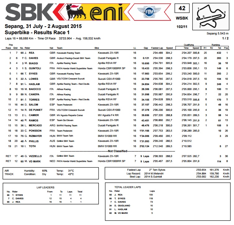 Nakon što ga je obišao, njegov timski kolega Rea je Daviesu s Ducatijem lukavo prepustio uživanje u vodstvu. A onda ga je u posljednjem krugu napao, što je kulminiralo dvostrukim međusobnim pretjecanjem u zadnjem zavoju, nakon čega je Rea s Kawasakijem prošao ciljem 12 stotinki sekunde ispred Daviesa. Deset sekundi kasnije kroz cilj prolazi umirovljeni Max Biaggi, koji je u Maleziji, baš kao i ranije u Misanu, nastupio s pozivnicom i bez imalo respekta prema svojim bitno mlađim kolegama s Aprilijom došao do 3. mjesta. Tako je u 44. godini života postao najstariji vozač koji se penjao na SBK podij, s time da je i dosadašnji rekord bio u njegovim rukama.