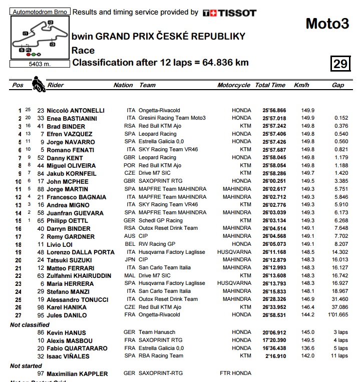 Jasno, Moto3 utrka je bila daleko najnapetija na nedjeljnom programu. Nakon masovnih sudara u prva dva zavoja prvog kruga, originalna utrka je prekinuta, nakon čega je natjecateljski program skraćen na samo 12 krugova. U vodećoj grupi se ubrzo izdvojilo desetak vozača, koji su se međusobno borili do posljednjeg metra, a u tom je kaosu do svoje prve pobjede došao Niccolo Antonelli, dok su drugu i treću stepenicu pobjedničkog podija popunili Bastianini i Binder. Trenutno vodeći Danny Kent je u pretposljednjem krugu imao kontakt s Navarrom, zbog čega je na kraju završio kao tek 7., no još uvijek ima popriličnu bodovnu prednost.