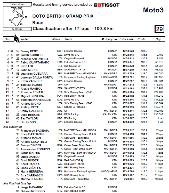 U Moto3 utrci je po pravom britanskom vremenu pobijedio novi britanski junak Danny Kent. Strpljivo je čekao da padne Isac Vinales, nakon čega je stvorio prednost od desetak sekundi i došao do 6. ovogodišnje pobjede. Po jakoj kiši je do drugog mjesta doplivao češki vozač Jakub Kornfeil, dok je sa sretnih 13 sekundi zaostatka treći bio Niccolo Antonelli. Svi ostali su bili druga liga, pa je tako četvrti Quartararo zaostao čak 50 sekundi, dok je Bastianini pao u pretposljednjem krugu dok je držao peto mjesto, čime se razmak između njega i vodećeg Kenta rastegnuo na 70 bodova.