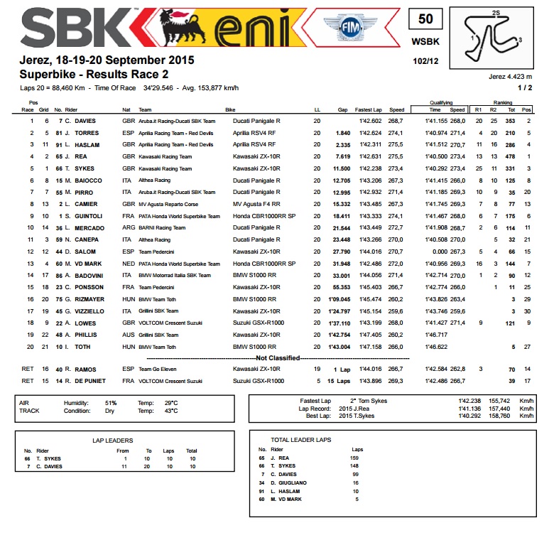 Rea je ponovo završio kao 4., dok je Sykes potonuo na 5. mjesto, no i s time je britanski dvojac osigurao Kawasakiju konstruktorski titulu. Tako je japanski proizvođač u jednom danu došao do trećeg vozačkog i prvog konstruktorskog naslova u Superbike prvenstvu. A čini se da će istu dvostruku krunu osvojiti i u Supersport prvenstvu.