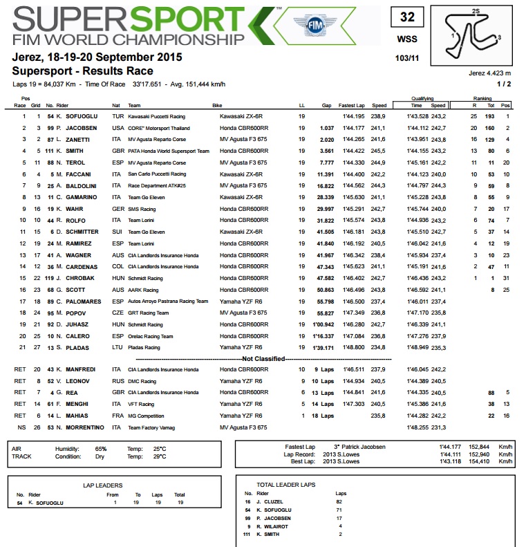 Iako mu je bio relativno blizu, Amerikanac Jacobsen ga ni u jednom trenutku nije napao, no i drugo mjesto mu je bilo dovoljno da preuzme i drugo mjesto u ukupnom poretku i ostane u igri za naslov, iako bi se trebalo dogoditi čudo da u preostale dvije utrke vozač Honde nadoknadi zaostatak od 33 boda. Treći je ciljem prošao Zanetti na MV Agusti, četvrti je bio Smith na Hondi, dok je Terol nastupio kao zamjena za ozlijeđenog Cluzela i u svojoj prvoj Supersport utrci došao do 5. mjesta.
