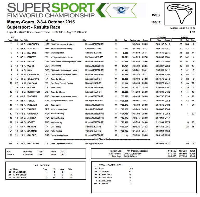 Iako je Jacobsen pobijedio, Sofuoglu je i s 2. mjestom potvrdio naslov prvaka, jednu utrku prije kraja sezone.
